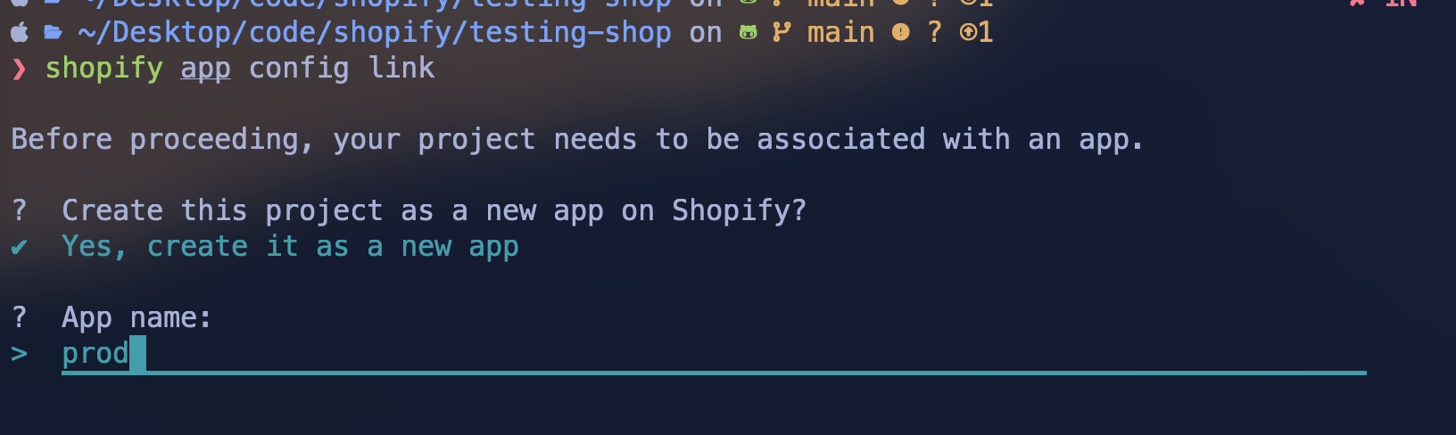 shopify app config linkto create a new configuration file for your app. You will be asked if you want to create a new app. Make sure to selectYES& give your new config a name to correspond to the environment you want to create.